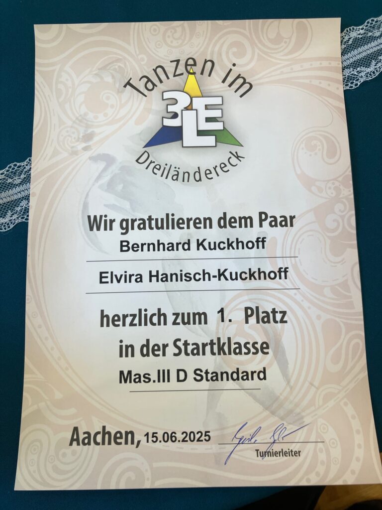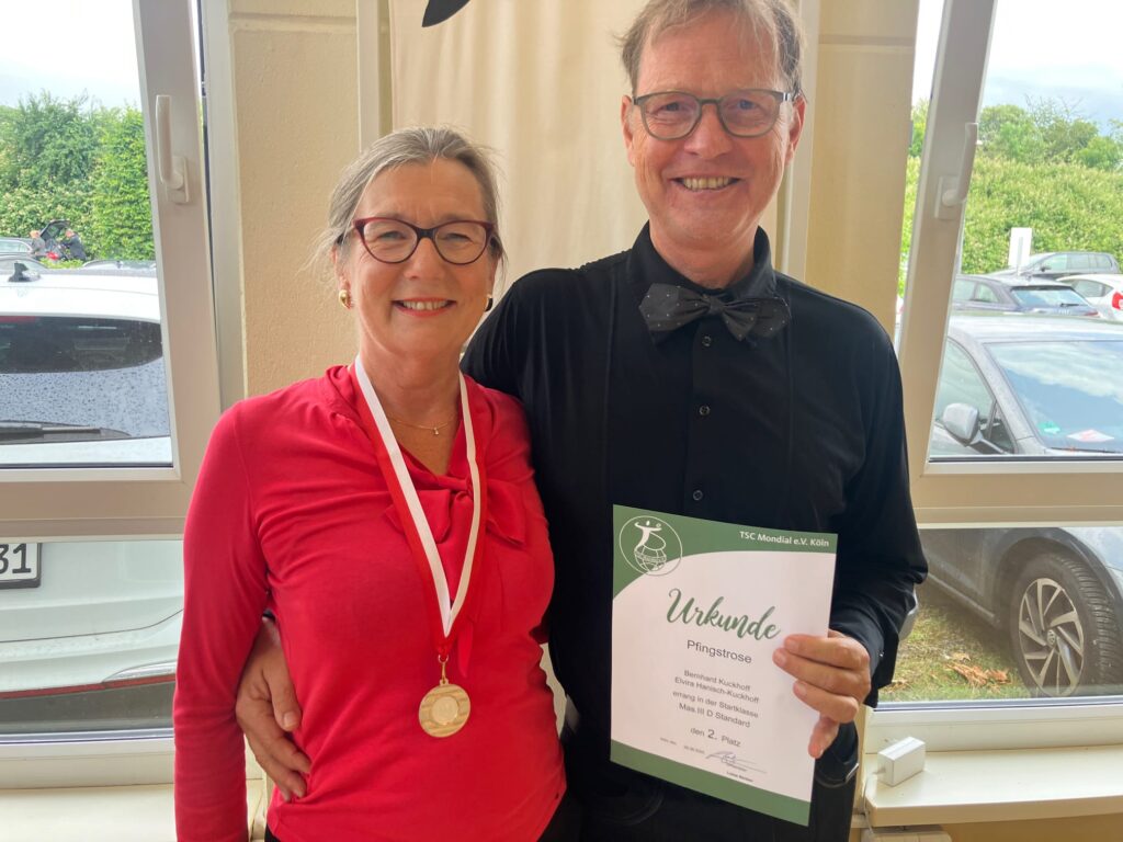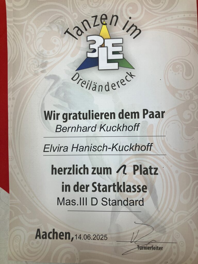 Nach einem regelrechten Turnier-Marathon feiern Bernhard und Elvira den Aufstieg in die C Klasse! An den letzten beiden Wochenenden tanzten die beiden bei der „Pfingstrose 2025“ im Mondial Köln und nahmen bei Tunrieren bei „Tanzen im Dreiländereck“ teil.